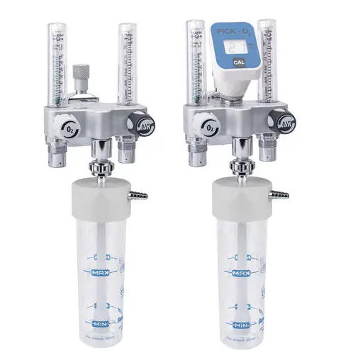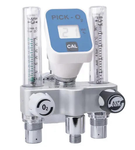 2006年同期还出现双流量计的气体混合设备,也称为“空氧混合器”。通过两个浮子流量计调节空气、氧气流速,气体混合输出后输出,达到氧浓度调节的目的。氧浓度控制需要调节空气、氧气两种气体的流速控制氧浓度,两种气体的流速加和是总输出流量;浓度需要计算或者查表得出氧浓度值,个别产品上配备了一个小型氧浓度显示装置。